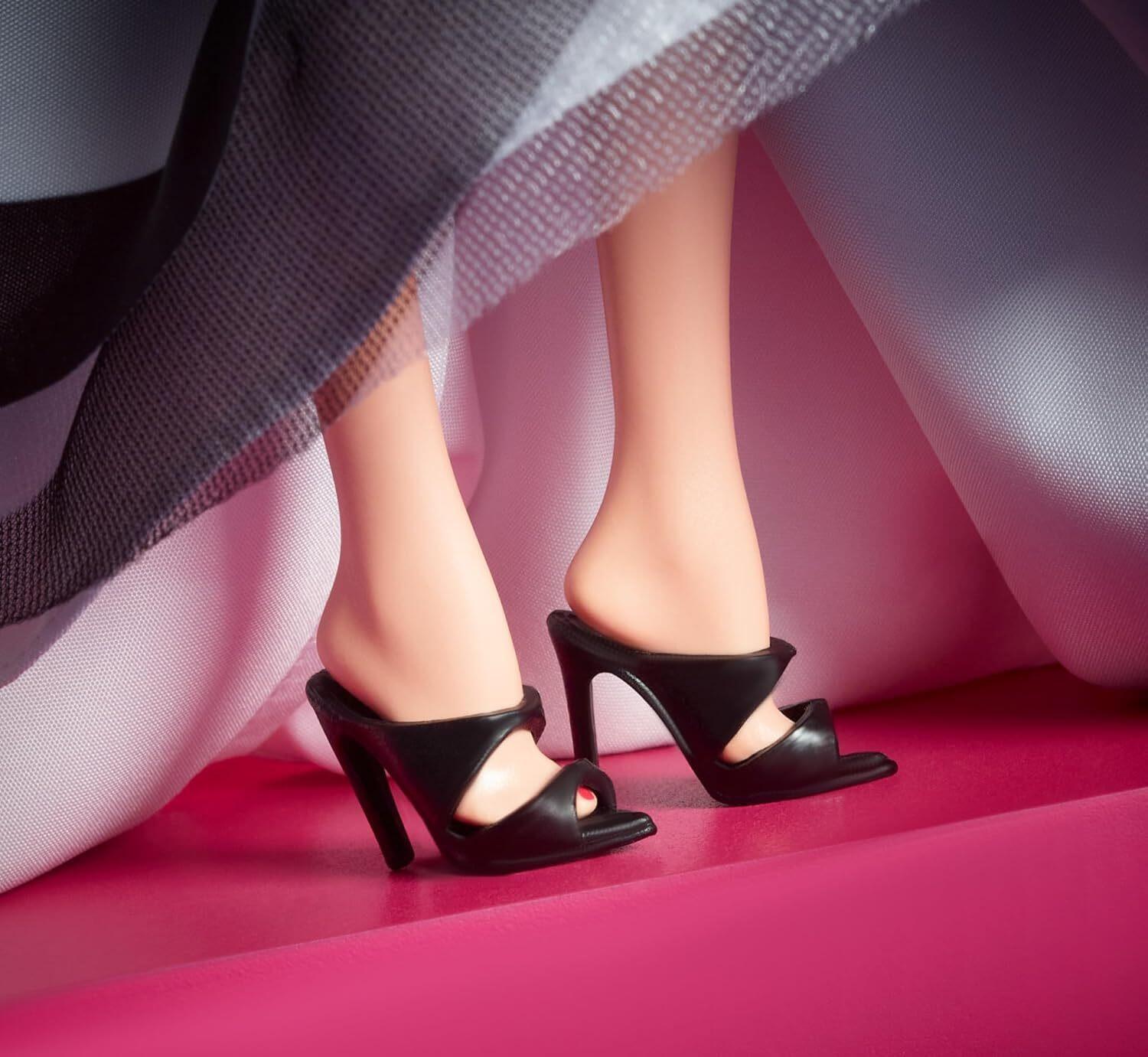 - La coda di cavallo a cascata, gli occhiali da sole a occhi di gatto, l'ombretto blu e le labbra rosse rendono omaggio alla prima Barbie, I lunghi guanti neri aggiungono un tocco di eleganza al suo look d'impatto