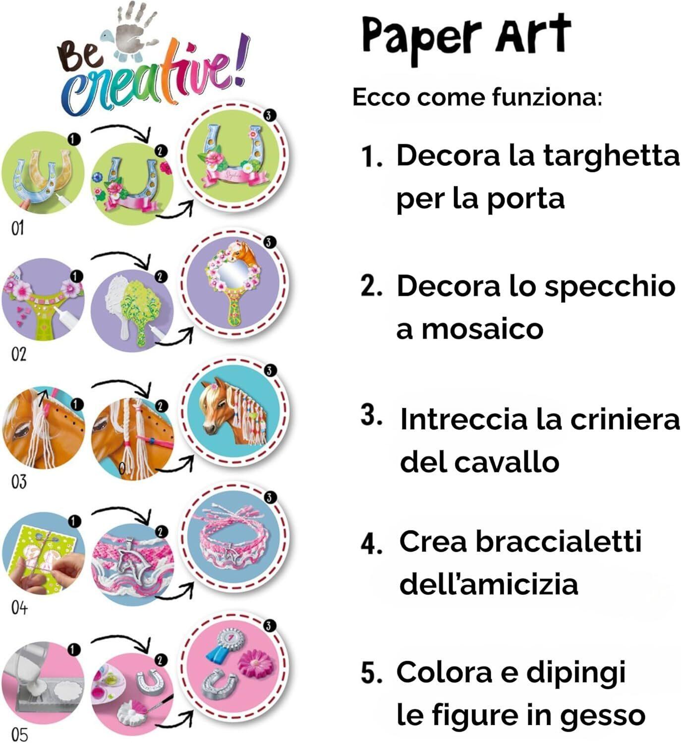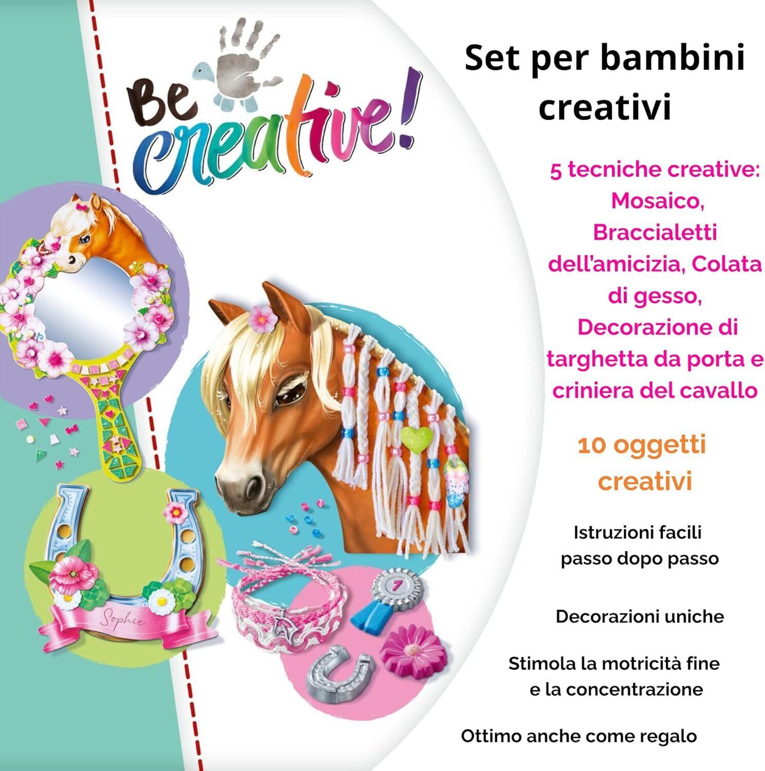 - DIVERTITI CON ATTIVITÀ SEMPRE DIVERSE: grazie a questo Be Creative multiattività è possibile esplorare diverse tecniche del fai da te grazie alla realizzazione del mosaico e dei braccialetti dell'amicizia, alla modellatura del gesso, alla decorazione di un cartello per la porta e alla criniera intrecciata