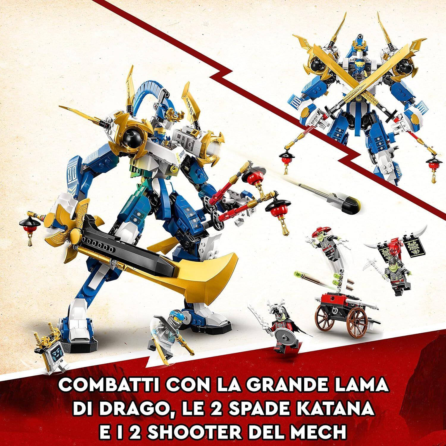 - Il potente mech di Jay è una gigantesca action figure alta 28 cm, con cabina di pilotaggio, una grande lama di drago, 2 spade giocattolo e 2 shooter sulle spalle, che si azionano ruotando un pulsante