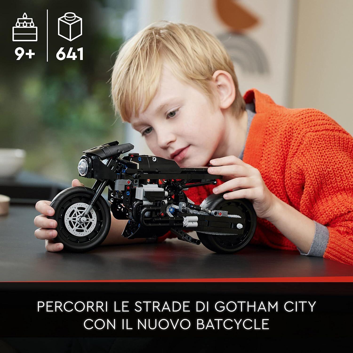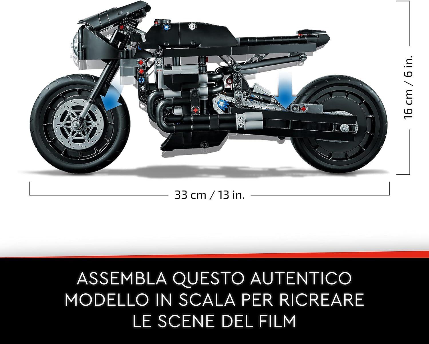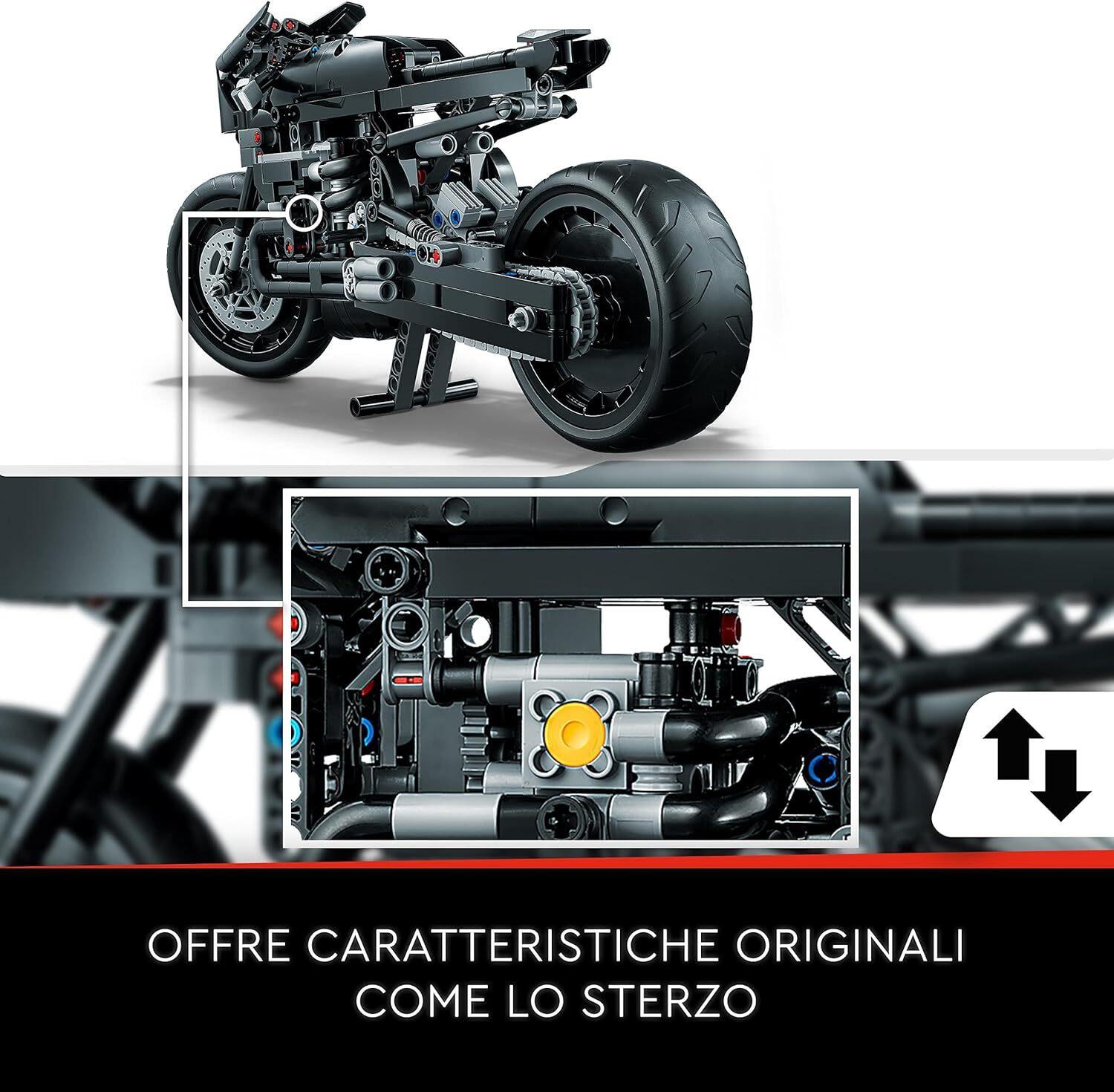 - I fan di Batman possono ricreare un veicolo iconico del famoso supereroe, con il modellino da costruire della moto giocattolo LEGO Technic BATCYCLE, ispirato al film del 2022: THE BATMAN