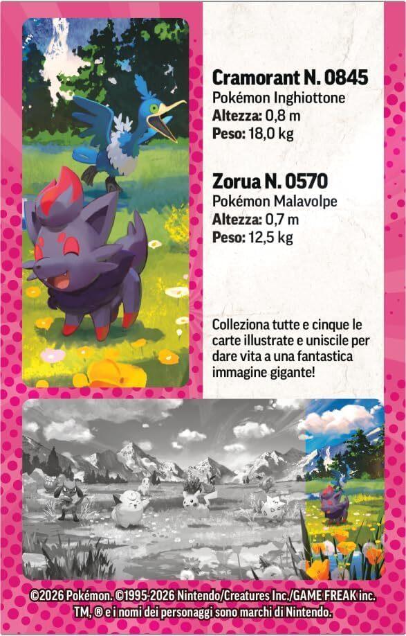• All’interno troverai inoltre un foglio di adesivi e una carta con l’illustrazione Pokémon esclusiva della miniscatola: puoi collezionarle tutte e cinque per completare l’immagine!