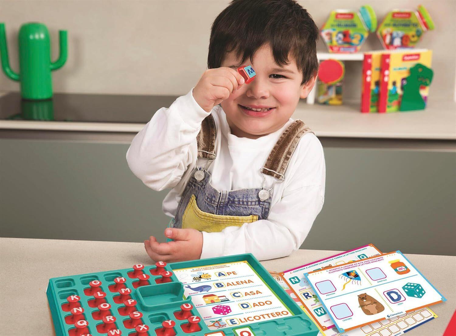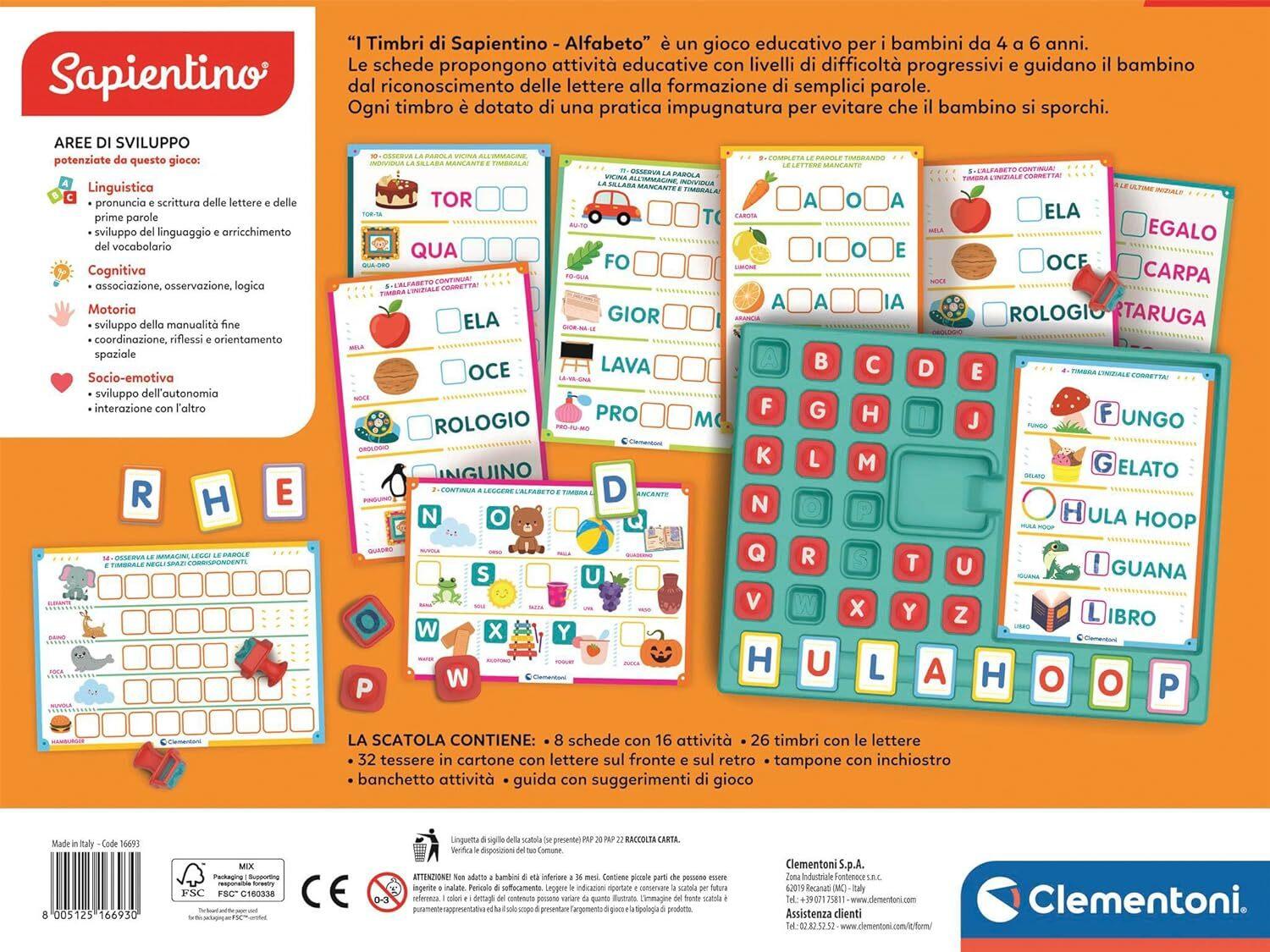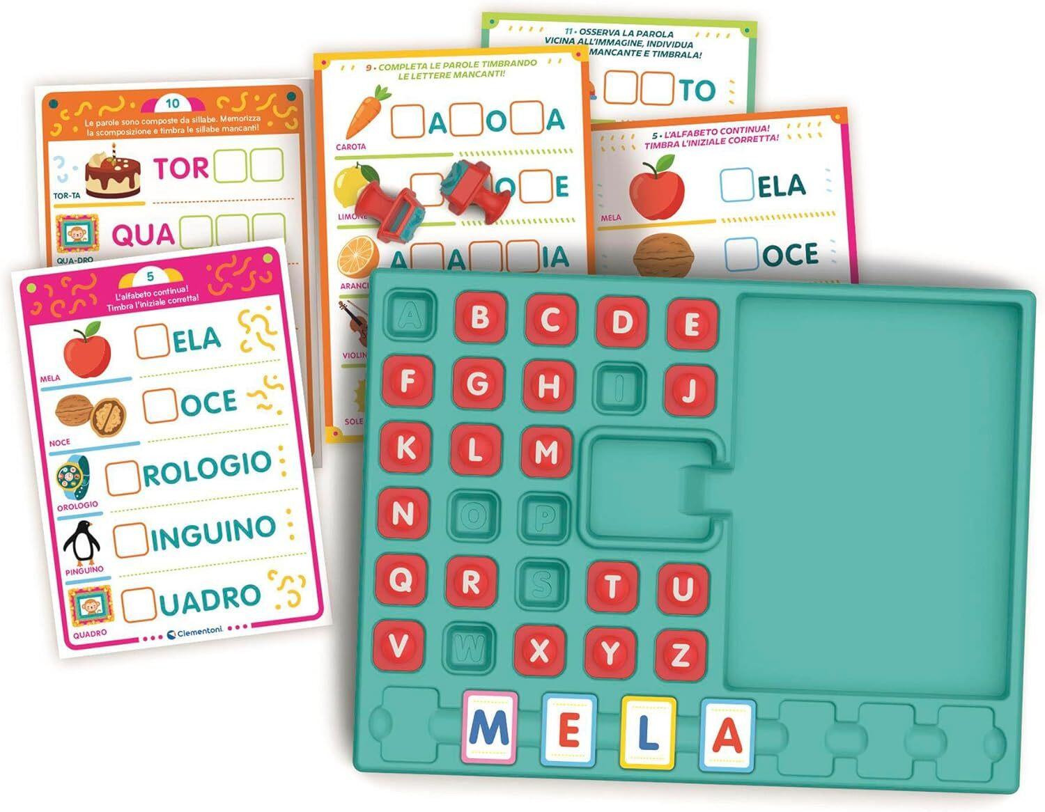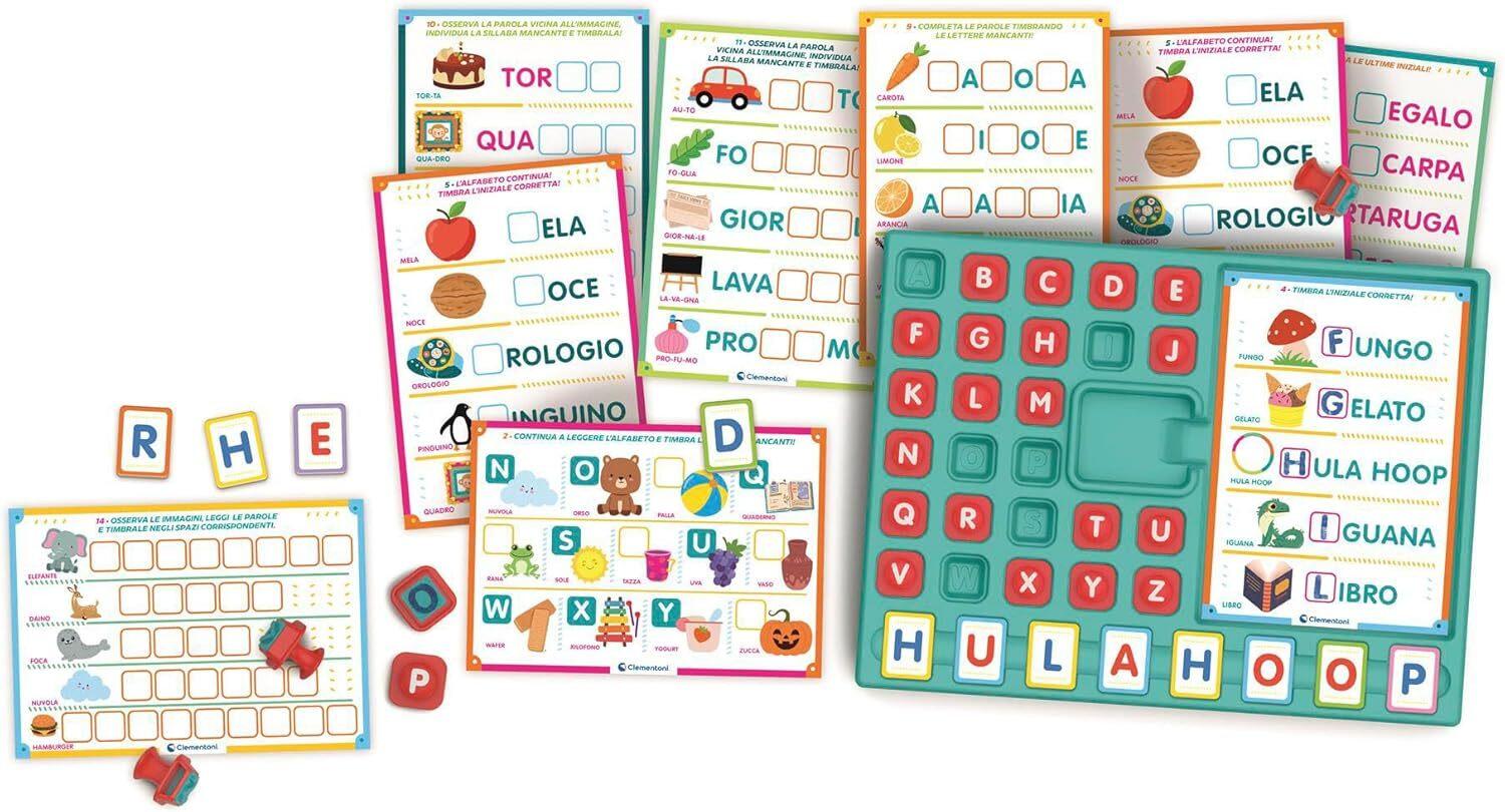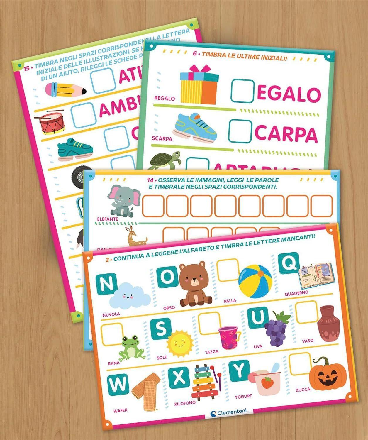 - COSA CONTIENE: gioco educativo Made in Italy per bambini dai 4 ai 6 anni, contiene 8 schede con 16 attività, 26 timbri lettere, 32 tessere in cartone con lettere fronte/retro, tampone con inchiostro, banchetto attività e guida con suggerimenti di gioco